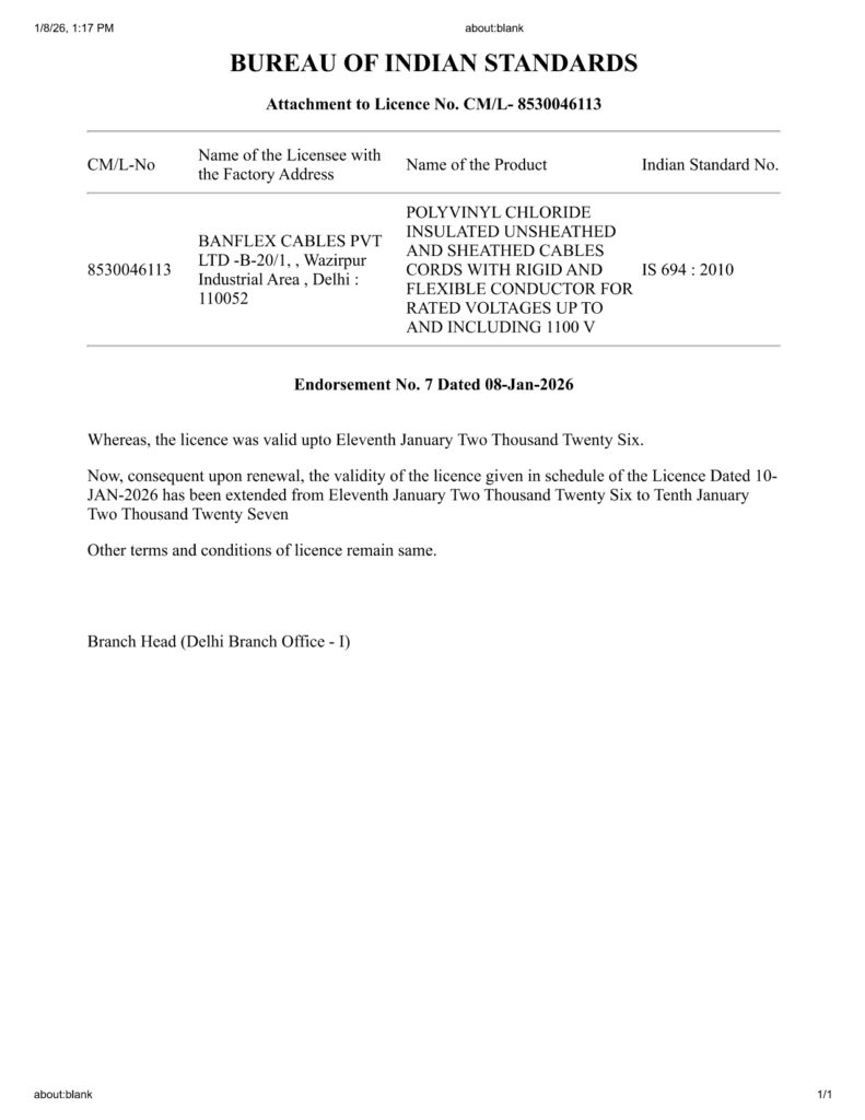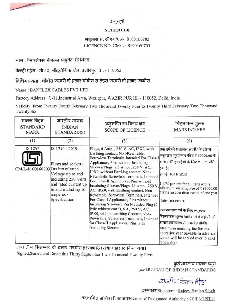Launched power cord manufacturing in compliance with IS 1293 standards.
